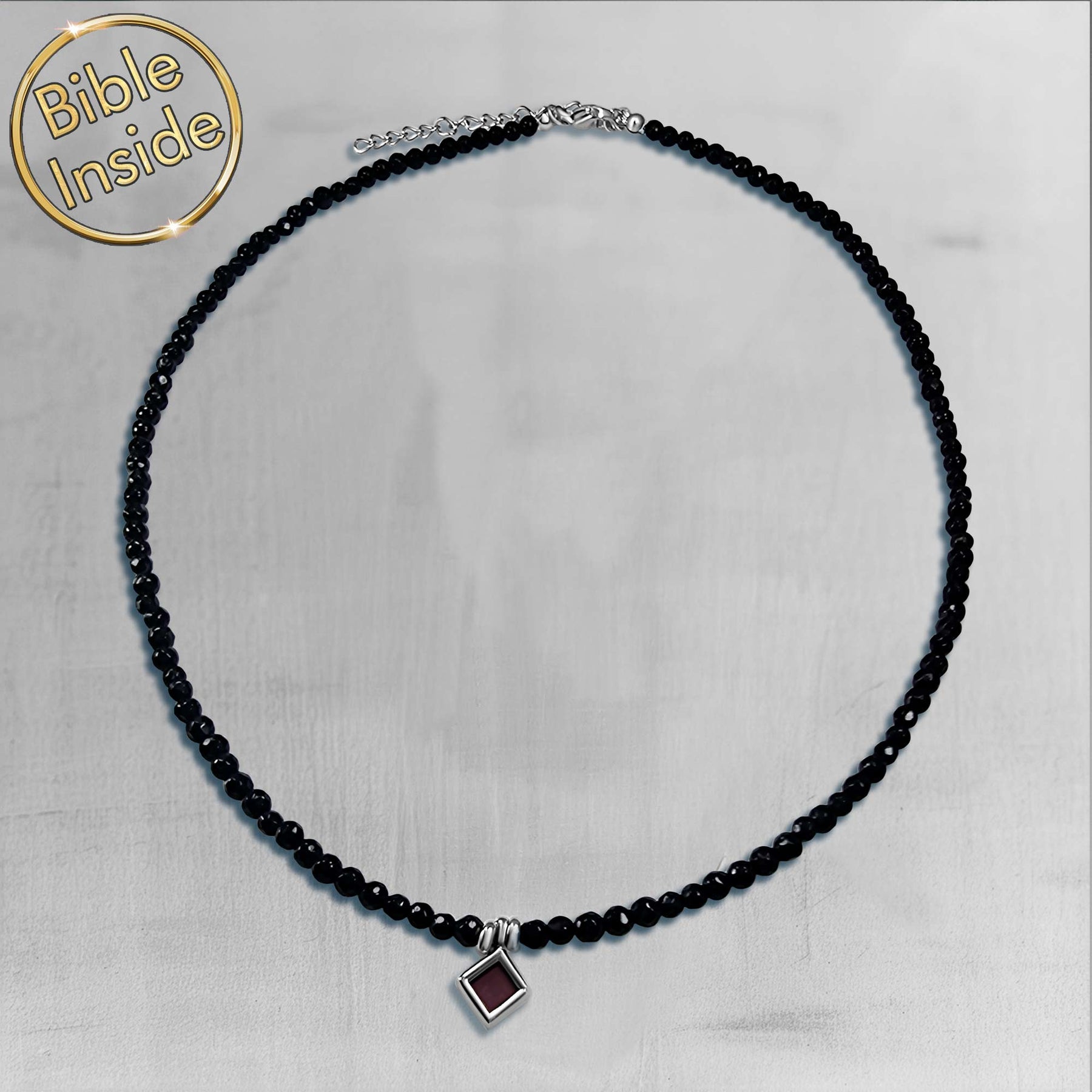 A scripture necklace featuring the New Testament engraved on a nano Bible chip, set within an elegant rhombus pendant adorned with a striking onyx stone. This minimalist design combines faith with contemporary style for everyday wear.