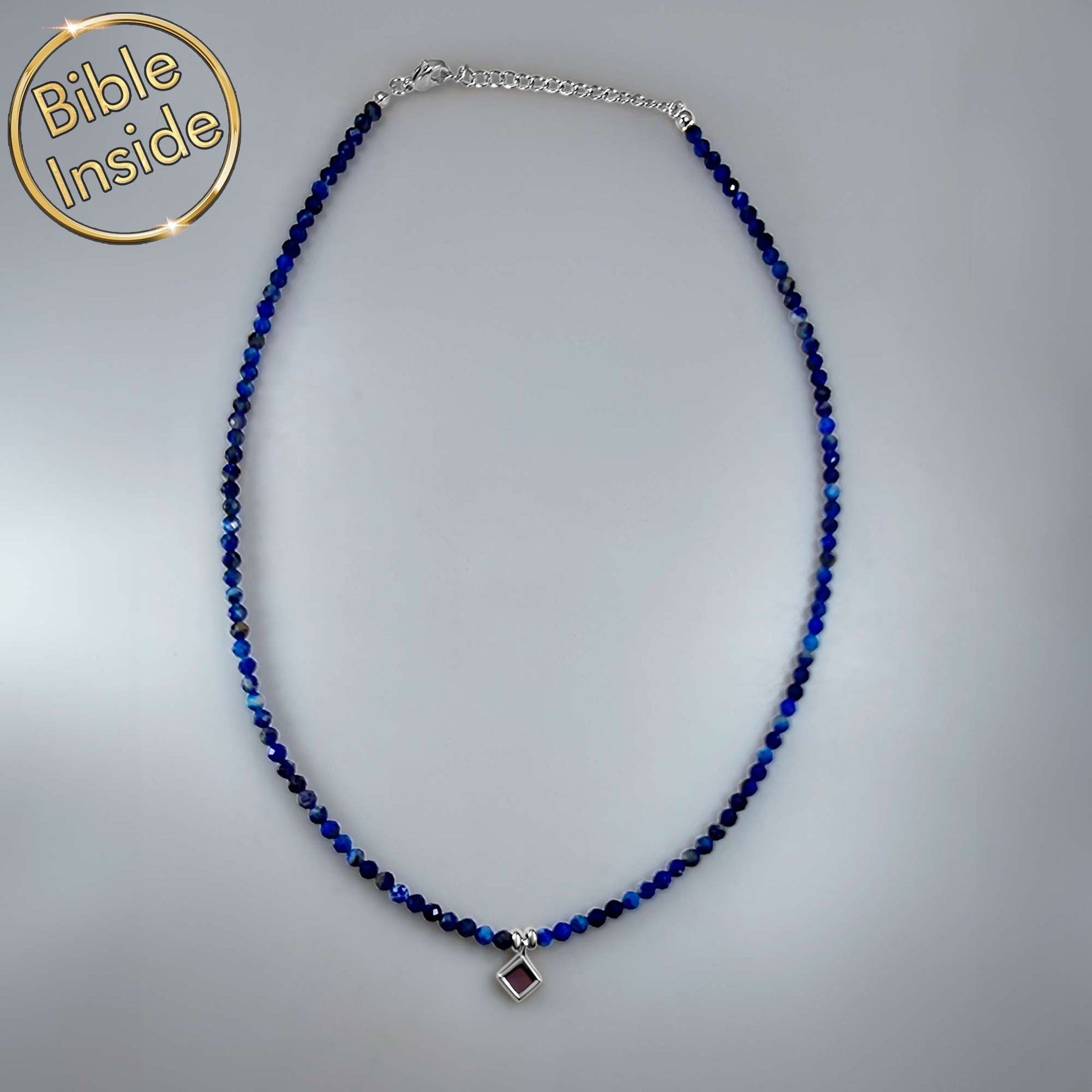 1. What makes this necklace unique? It combines a complete New Testament nano Bible chip (0.2"/0.5cm) with natural lapis lazuli stone—both devotional and fashionable.
