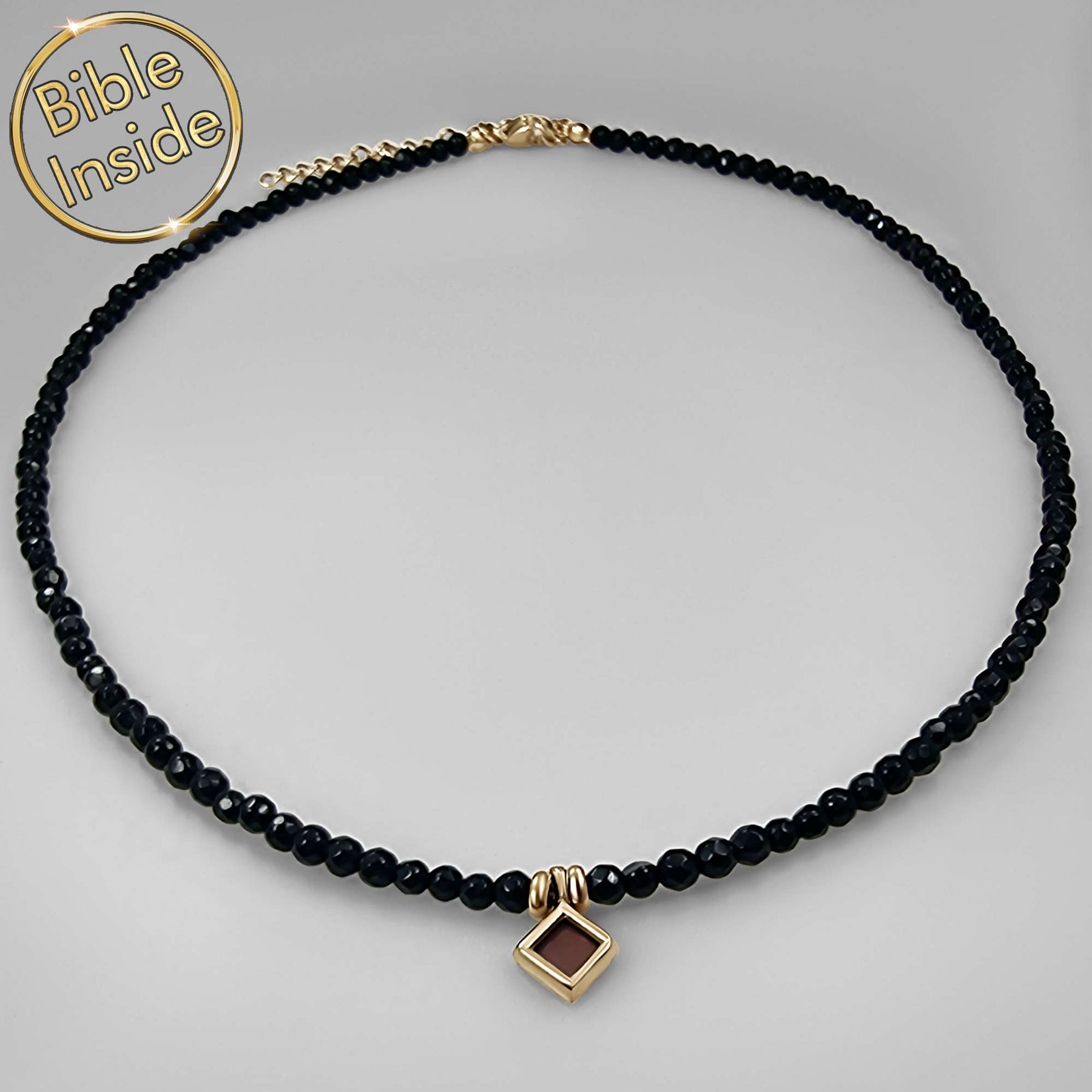 Jewelry for Christians meets modern elegance in this rhombus pendant necklace. Featuring a miniature Bible chip engraved with sacred scripture, the Terra Onyx design combines timeless symbolism with Christian faith jewelry craftsmanship.