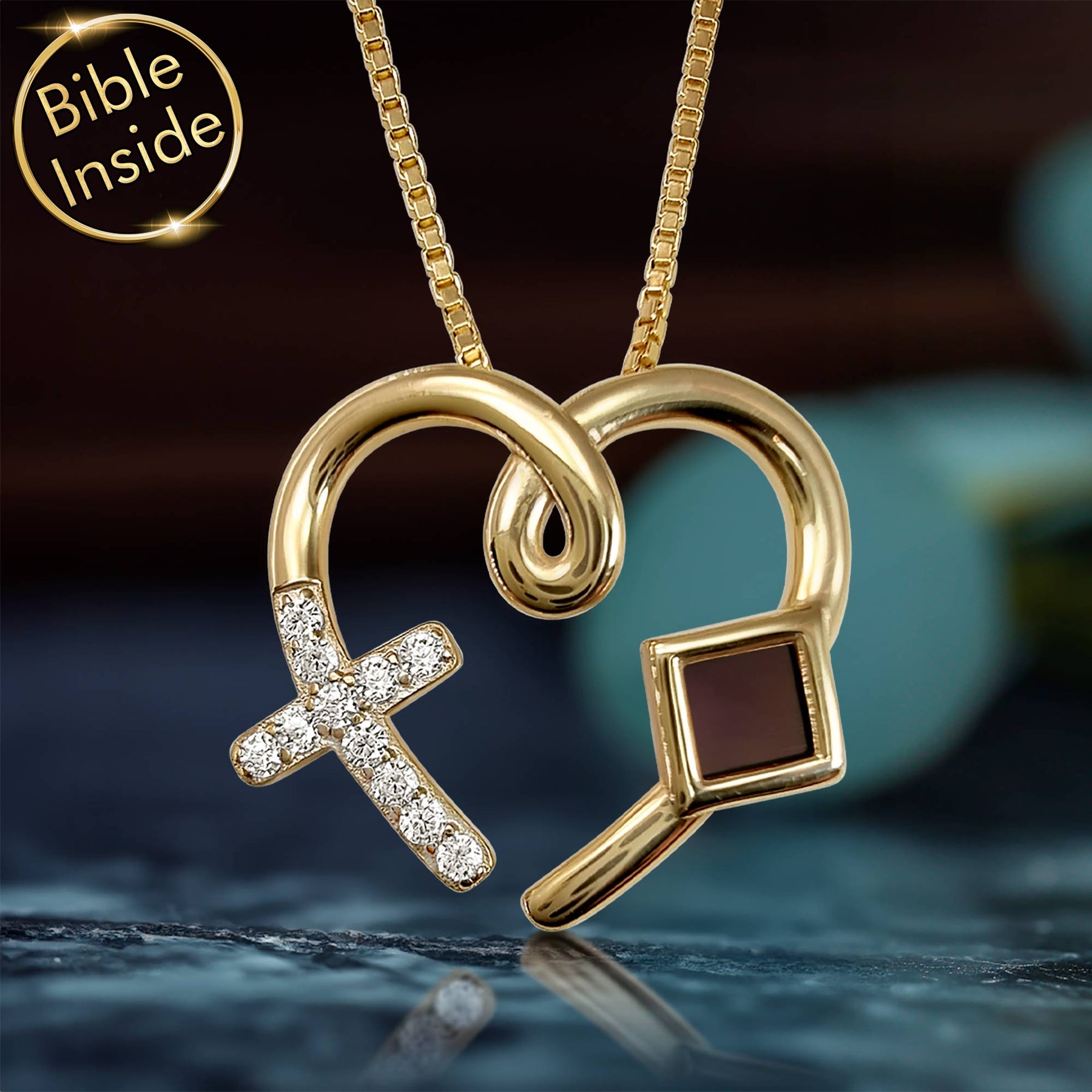 Q: What makes this piece unique as a Christian Christmas gift? A: It combines meaningful symbolism through the heart and cross design with the marvel of carrying the New Testament in jewelry form.
