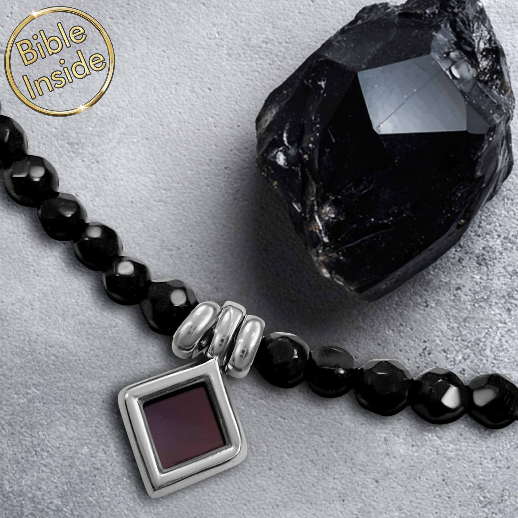 This exquisite jewelry piece transforms how females express their faith through the Terra Onyx Necklace. This rhombus-shaped pendant contains an entire microchip Bible engraved on a tiny 0.2"/0.5cm square. Every word of the New Testament rests within this delicate form.