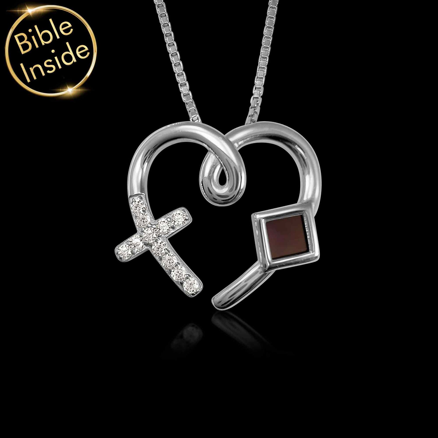 Silver Bible on jewelry featuring heart pendant for Christian women