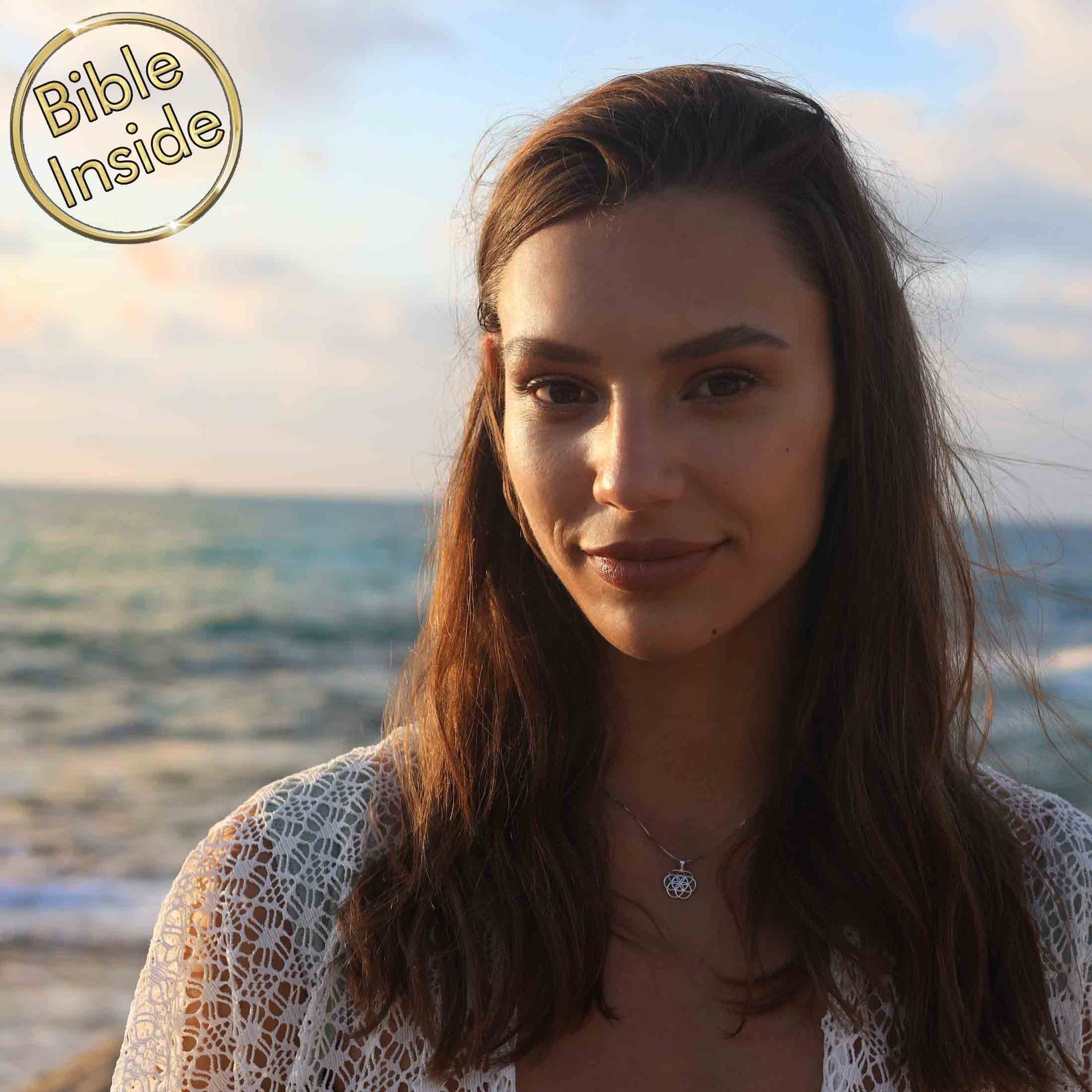 Each of our jewelry pieces has a hidden treasure: the entire Bible written inside the brown square. Our designs complement the holy Bible, wrapping it in beautiful jewelry.